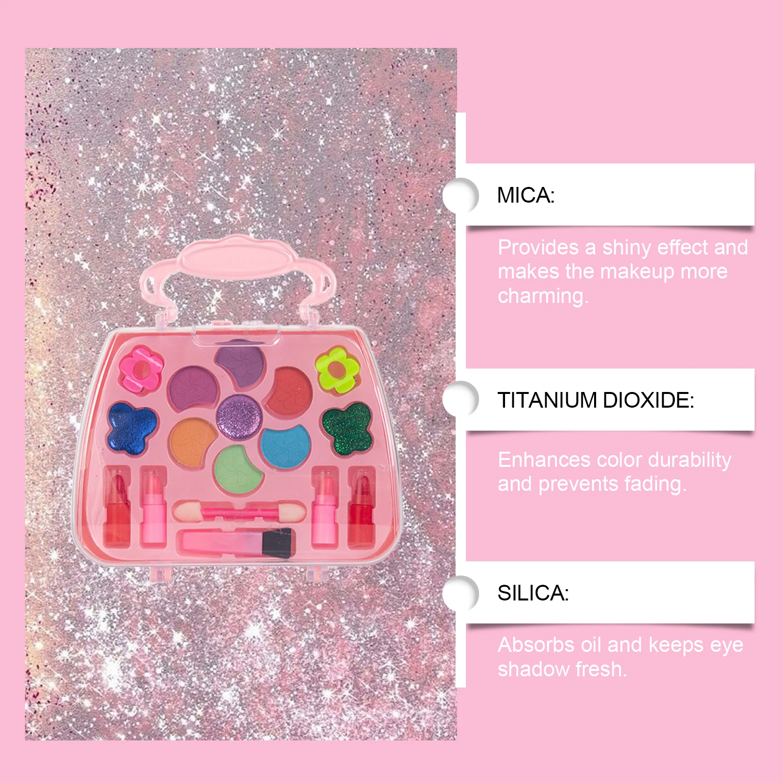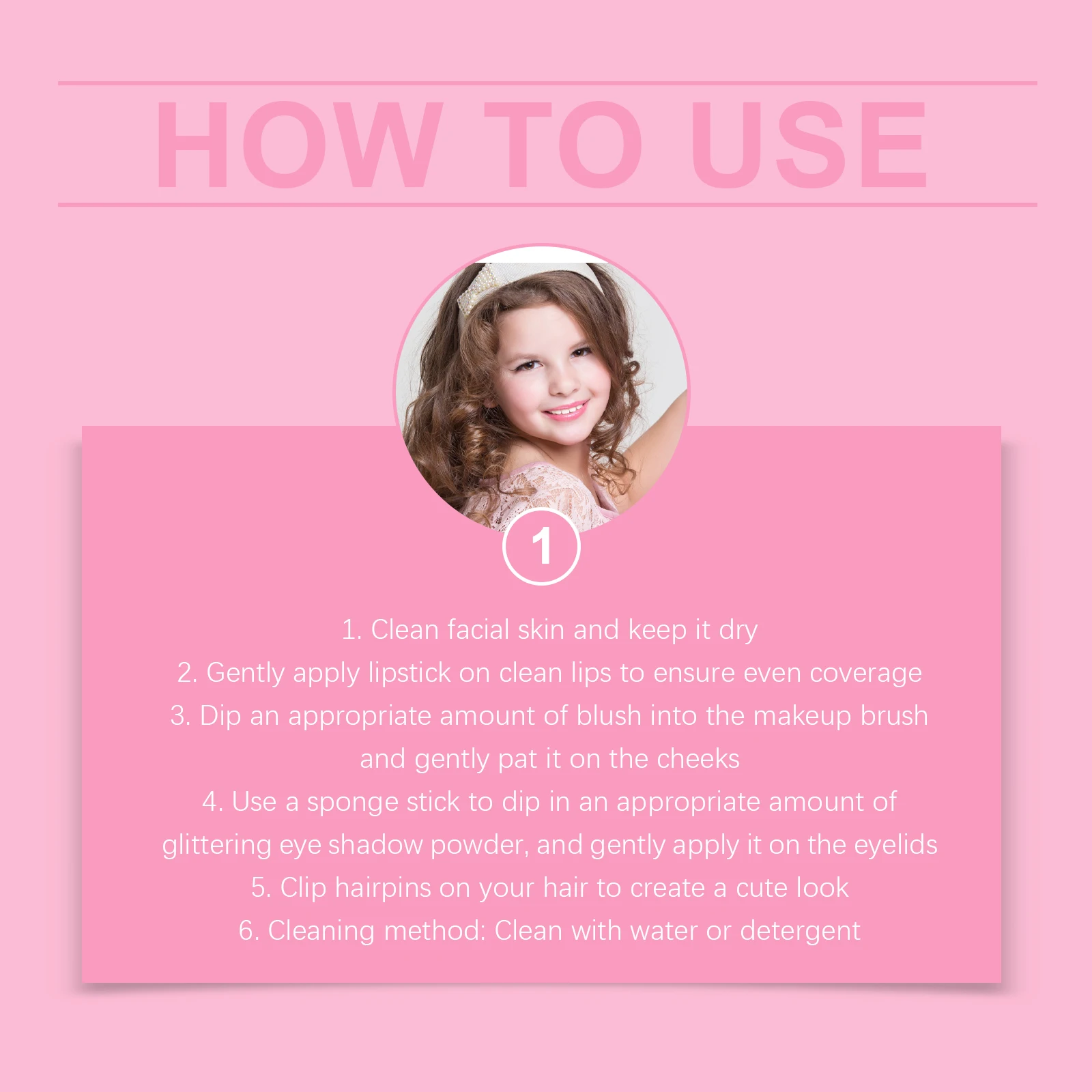 2. Contains lipstick, blush, glittering eye shadow powder, hairpins and makeup tools to meet children's daily makeup needs and allow children to show off their little beauty.